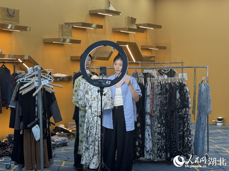 Salespeople sell clothing in a livestreaming studio at the China (Tianmen) Garment E-commerce Market in Tianmen, central China's Hubei Province. (People's Daily Online/Zhang Jun)