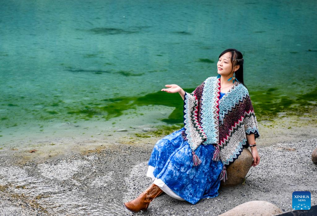 A tourist poses for photos at the Lanyue (Blue Moon) Valley in Lijiang City, southwest China's Yunnan Province, Sept. 8, 2025. (Xinhua/Jin Mamengni)