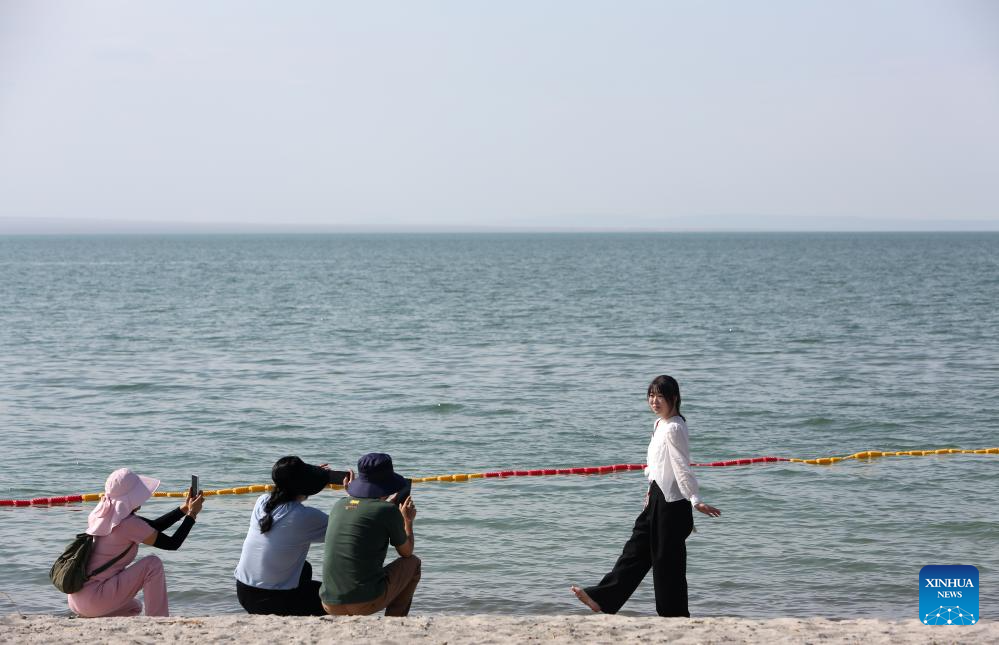 Tourists enjoy leisure time on the beach by the Ulunggur Lake in Fuhai County of Altay, northwest China's Xinjiang Uygur Autonomous Region, Sept. 8, 2025. (Xinhua/Cheng Li)