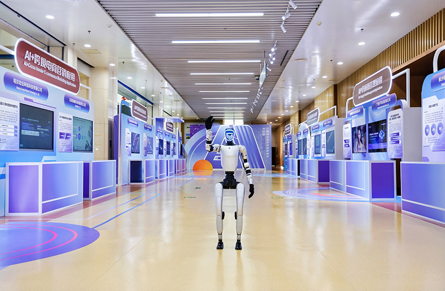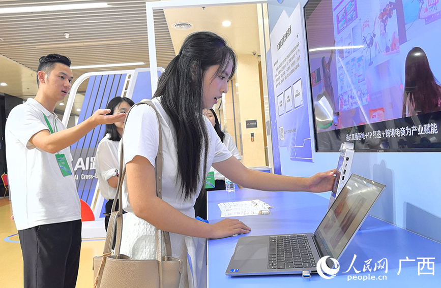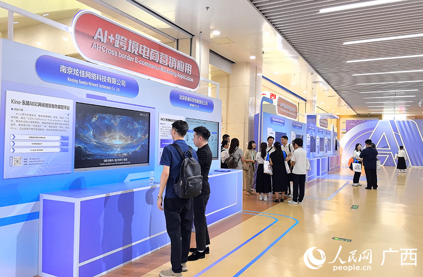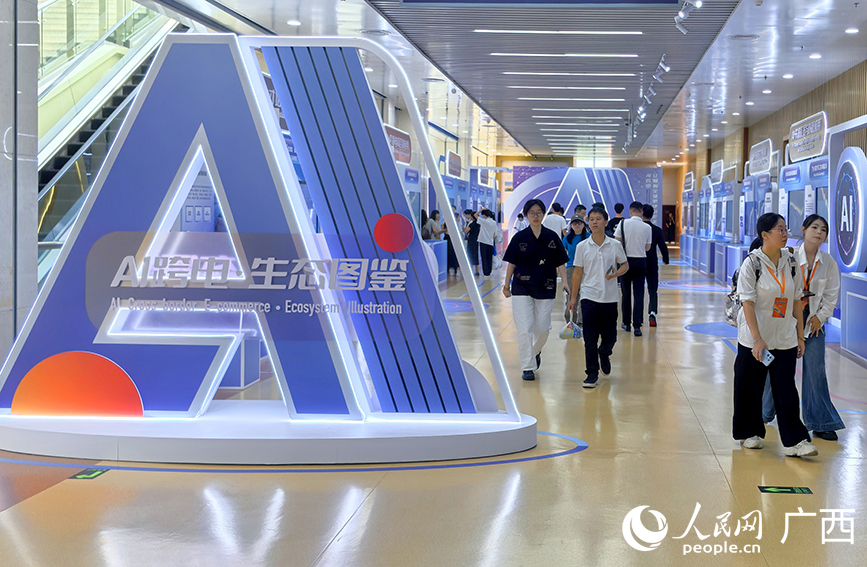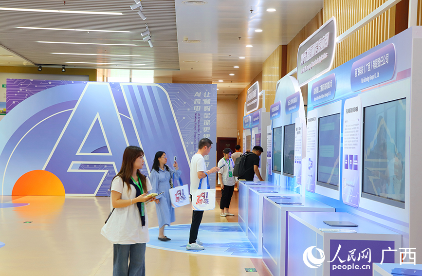 Visitors tour an exhibition displaying outstanding projects from the 2025 China-ASEAN "AI+Cross-border E-Commerce" Innovative Application Competition in Nanning, south China's Guangxi Zhuang Autonomous Region, Sept. 5, 2025. (People's Daily Online/Fu Huazhou)
