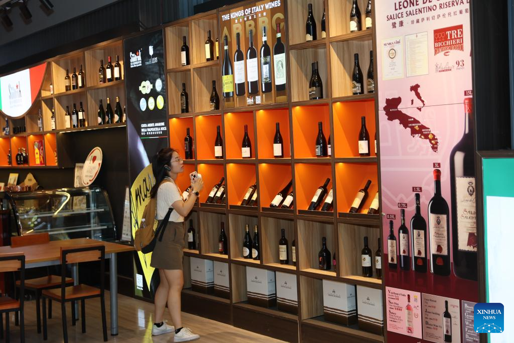 A visitor views wines displayed at the Hongqiao Import Commodities Expo and Trade Center in Shanghai, east China, Sept. 9, 2025. (Xinhua/Wang Xiang)