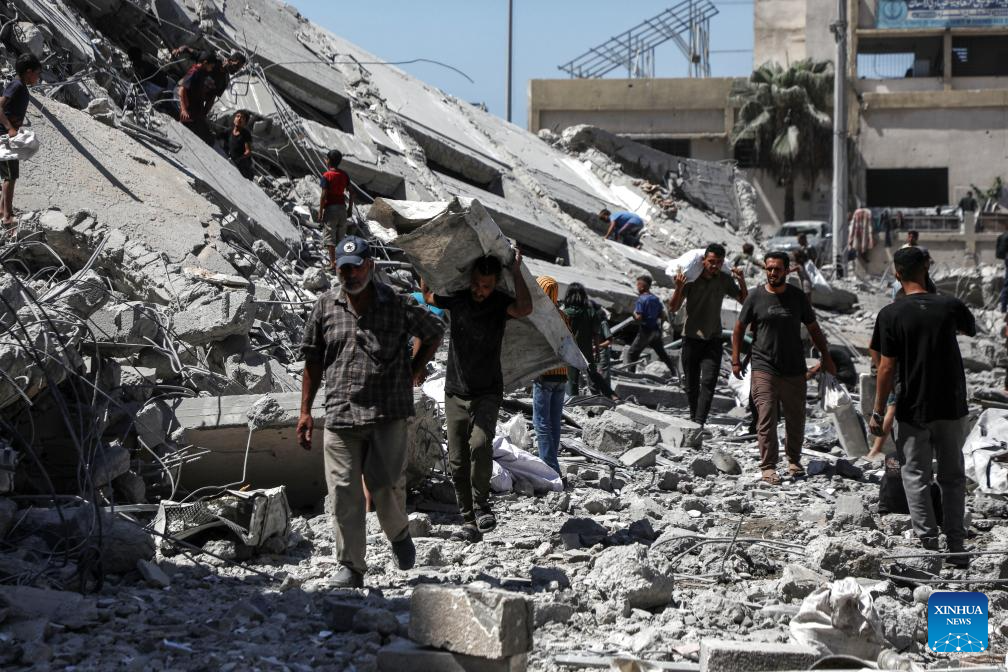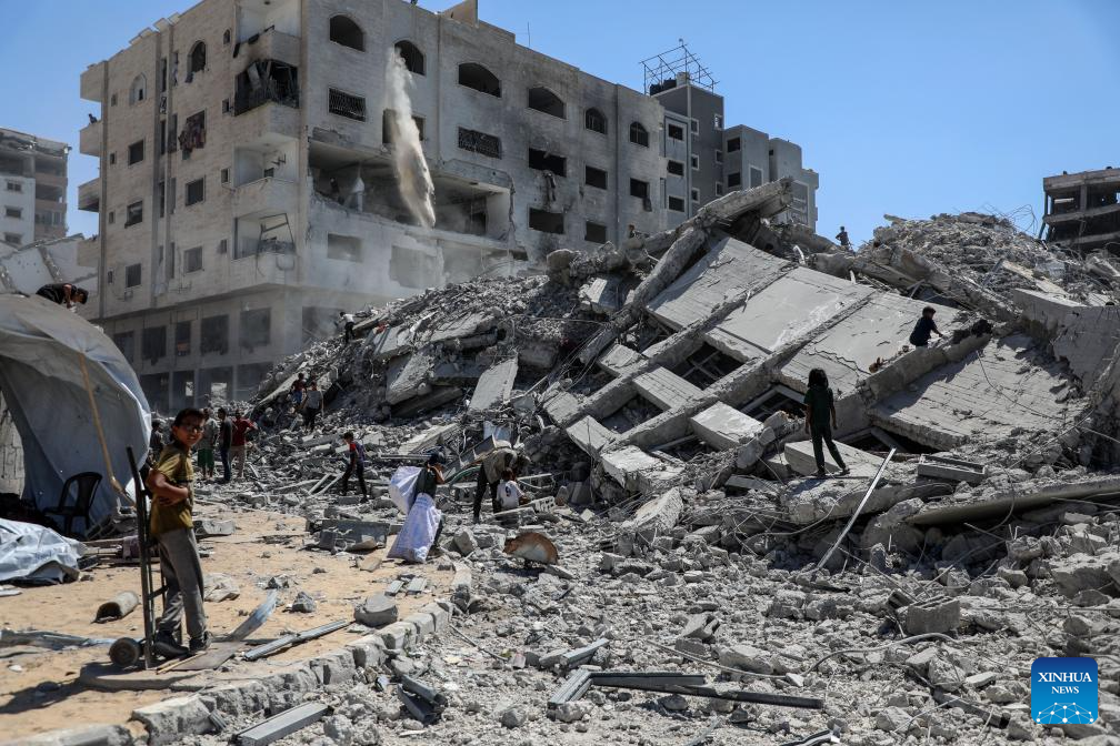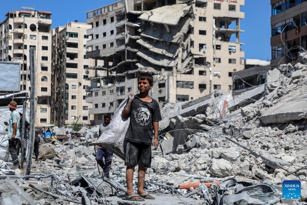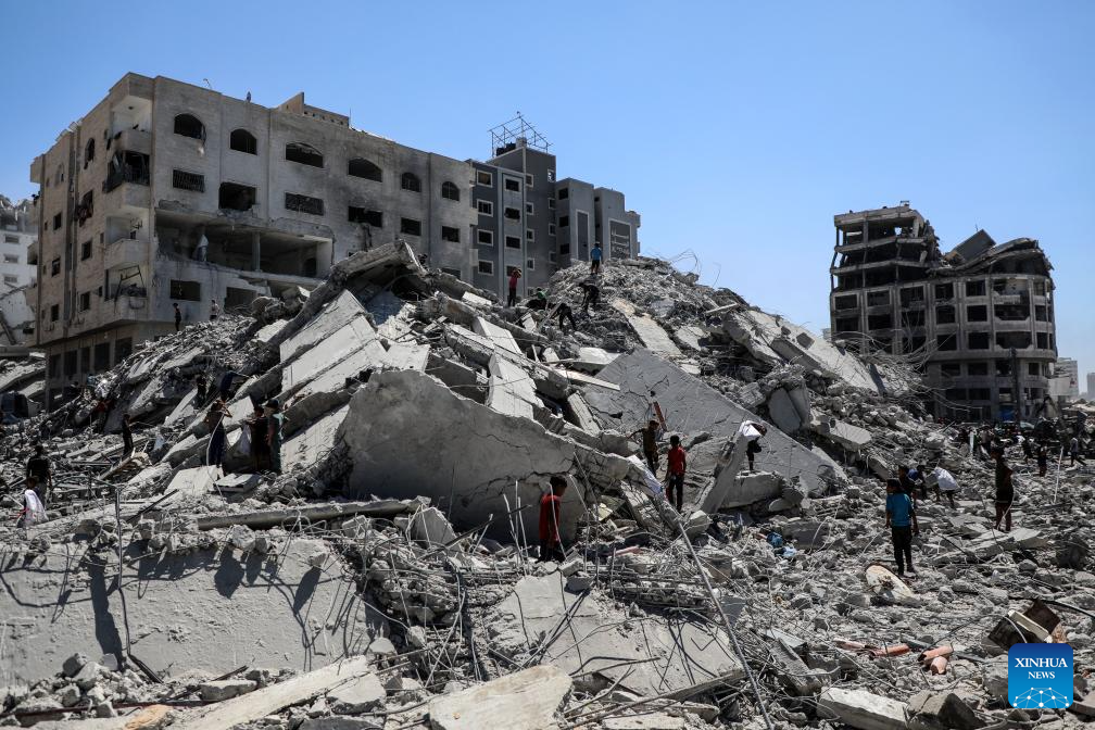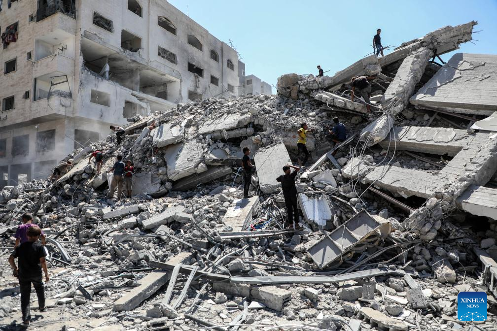Palestinians inspect the damage to the 11-story Taiba Tower following an Israeli airstrike in west of Gaza City, on Sept. 10, 2025. (Photo by Rizek Abdeljawad/Xinhua)