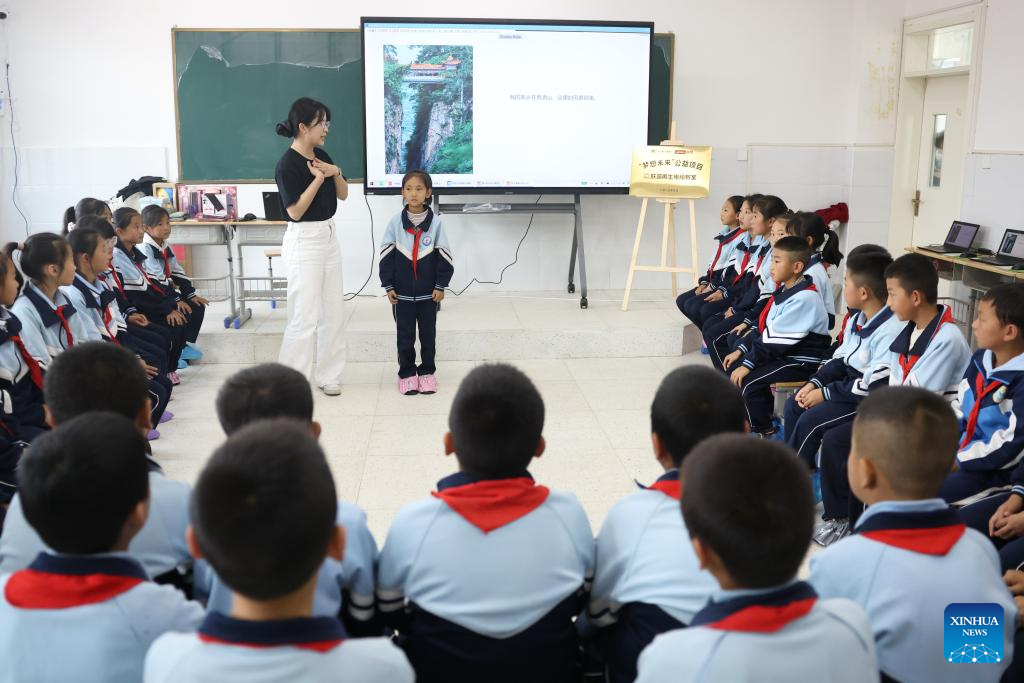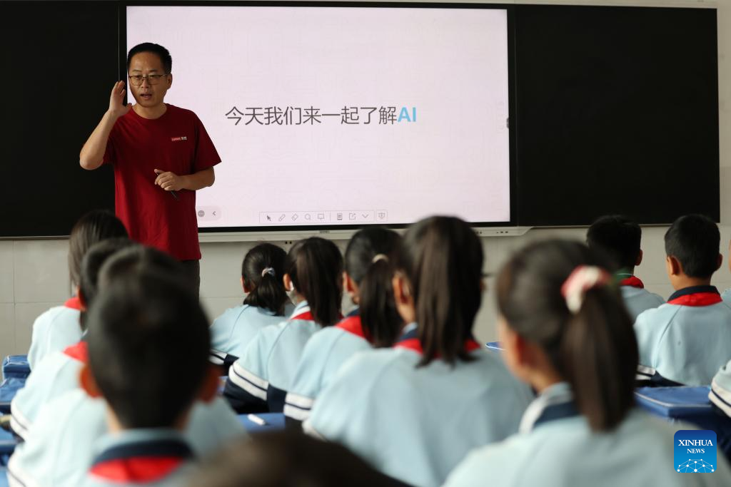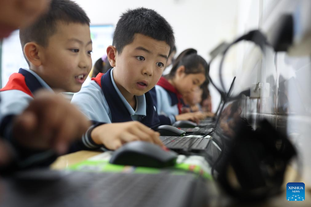 Children attend an AI-themed lecture at a computer classroom at Yanchuan school of Zhangxian County, Dingxi City of northwest China's Gansu Province, on Sept. 10, 2025. (Xinhua/Chen Bin)