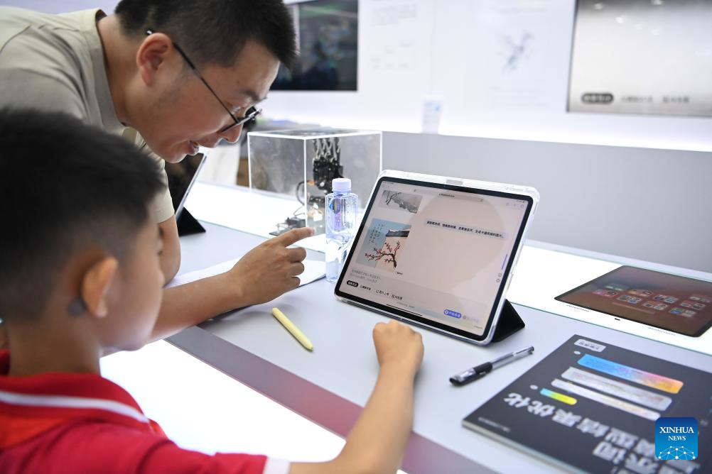 A child looks at a latest AI educational product at the 2025 China International Fair for Trade in Services (CIFTIS) in Beijing, capital of China, Sept. 11, 2025. The 2025 CIFTIS opened in Beijing on Wednesday, themed "Embrace Intelligent Technologies, Empower Trade in Services." (Xinhua/Xiao Xiao)