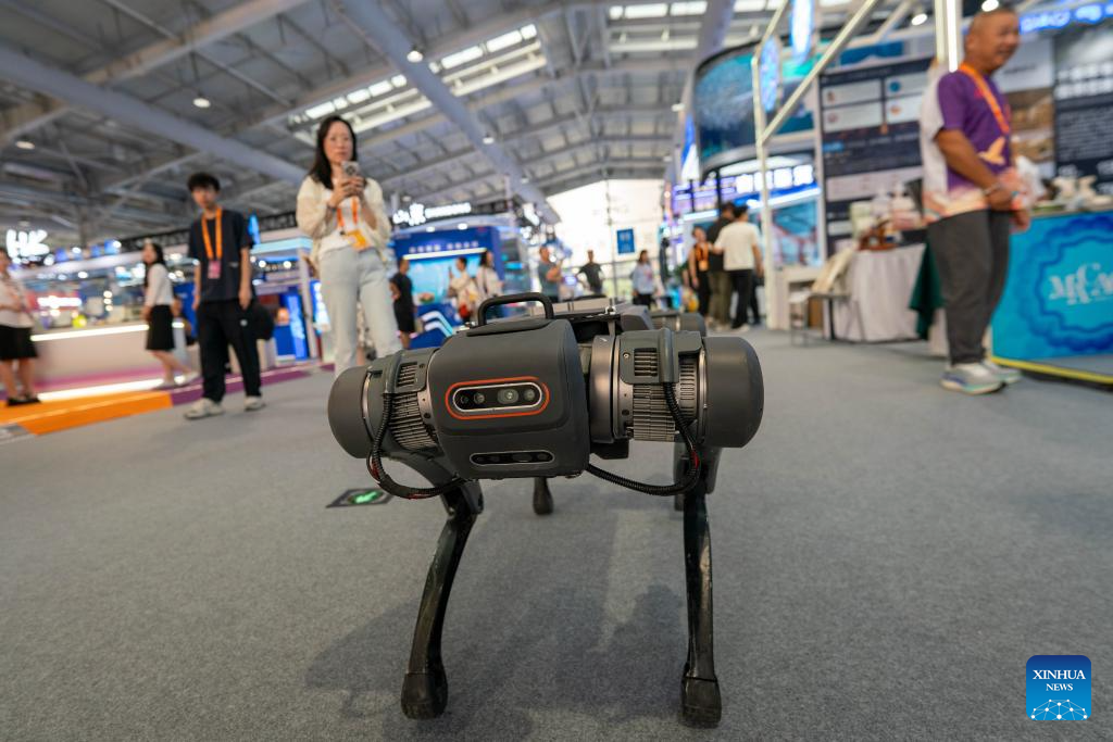 A robot dog is seen walking at the exhibition hall at the 2025 China International Fair for Trade in Services (CIFTIS) in Beijing, capital of China, Sept. 11, 2025. The 2025 CIFTIS opened in Beijing on Wednesday, themed "Embrace Intelligent Technologies, Empower Trade in Services." (Xinhua/Xie Han)