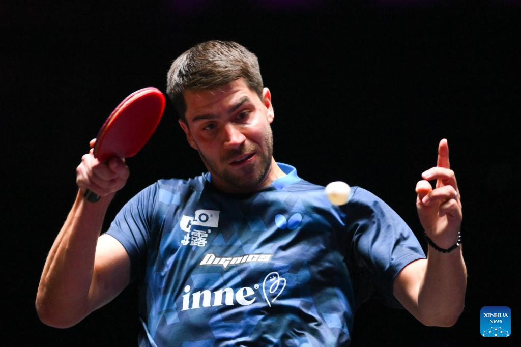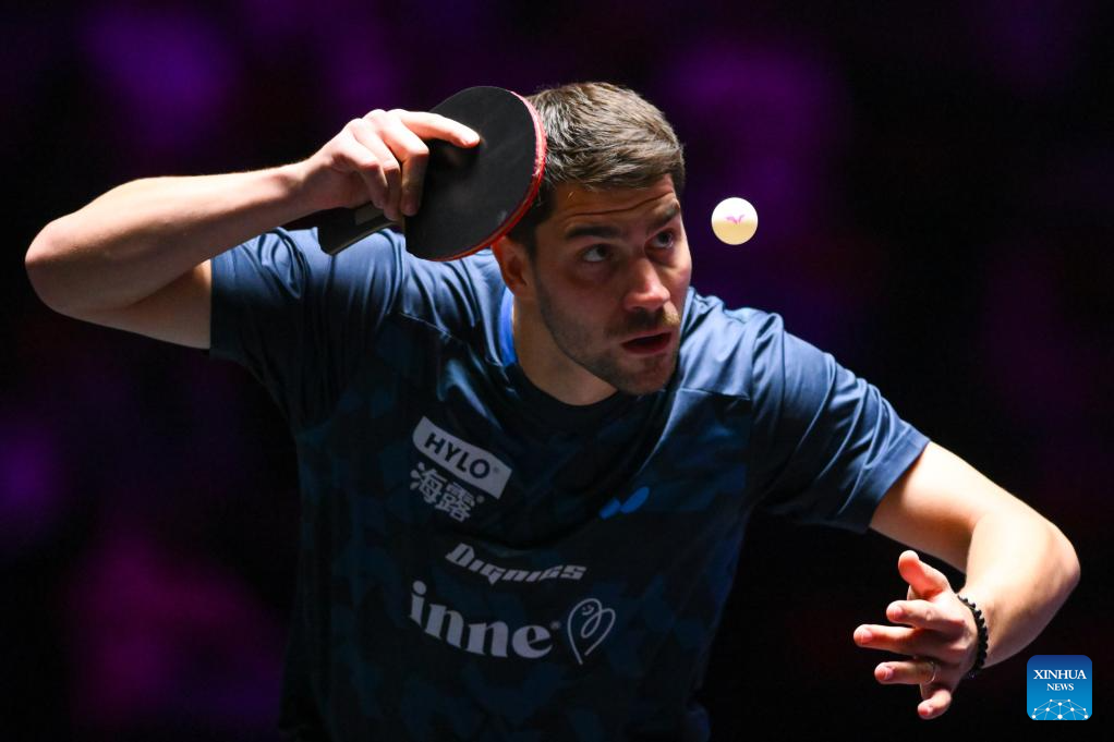 Patrick Franziska of Germany hits a return during the men's singles round of 16 match against Quadri Aruna of Nigeria at the 2025 World Table Tennis (WTT) Champions Macao in Macao, south China, Sept. 12, 2025. (Xinhua/Cheong Kam Ka)