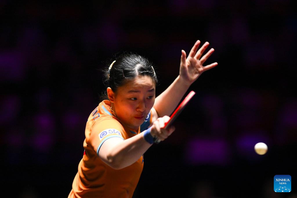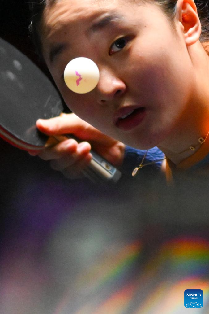 Chen Xingtong of China hits a return during the women's singles round of 16 match against Doo Hoi Kem of China's Hong Kong at the 2025 World Table Tennis (WTT) Champions Macao in Macao, south China, Sept. 12, 2025. (Xinhua/Cheong Kam Ka)