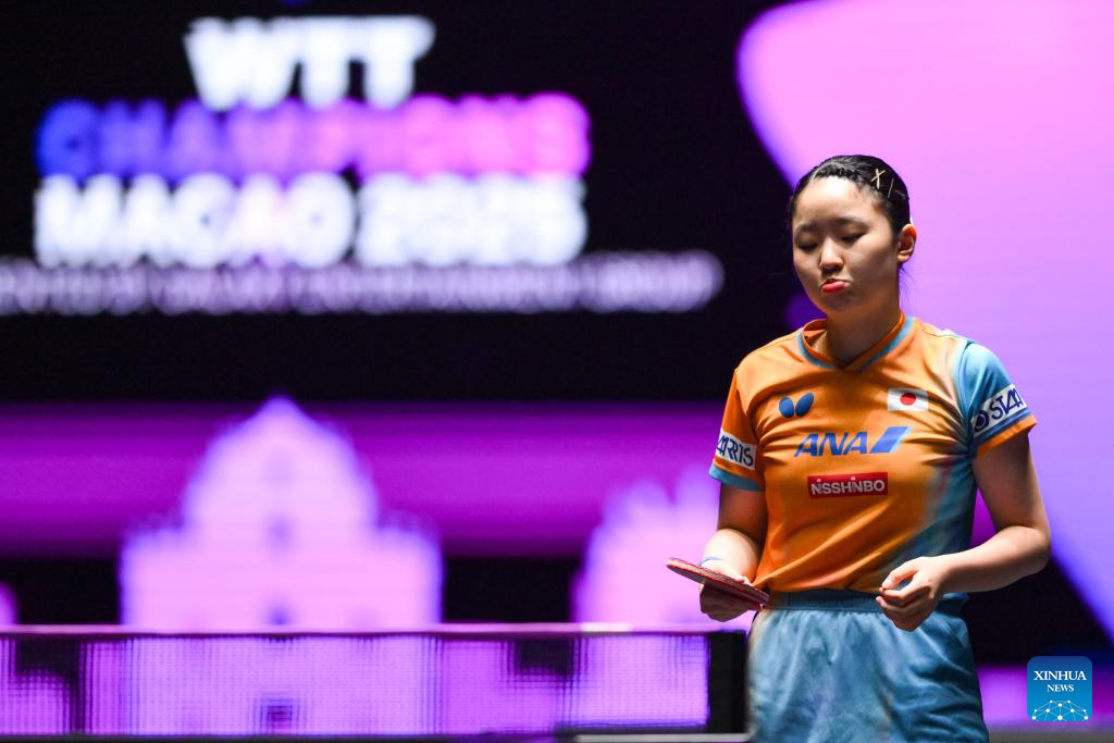 Harimoto Miwa of Japan reacts during the women's singles round of 16 match against Odo Satsuki of Japan at the 2025 World Table Tennis (WTT) Champions Macao in Macao, south China, Sept. 12, 2025. (Xinhua/Cheong Kam Ka)