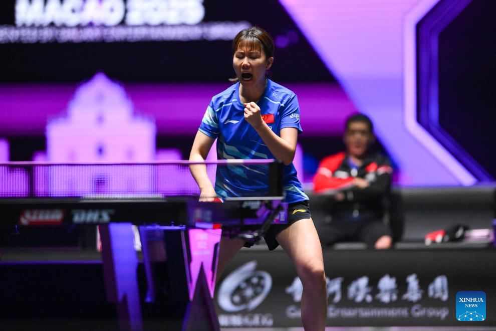 Chen Xingtong of China reacts during the women's singles round of 16 match against Doo Hoi Kem of China's Hong Kong at the 2025 World Table Tennis (WTT) Champions Macao in Macao, south China, Sept. 12, 2025. (Xinhua/Cheong Kam Ka)