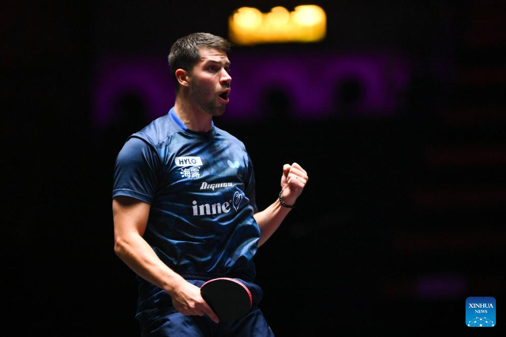 Patrick Franziska of Germany celebrates during the men's singles round of 16 match against Quadri Aruna of Nigeria at the 2025 World Table Tennis (WTT) Champions Macao in Macao, south China, Sept. 12, 2025. (Xinhua/Cheong Kam Ka)
