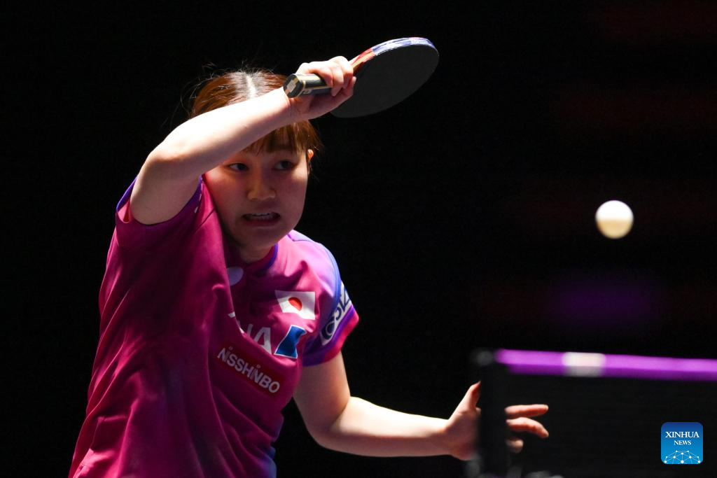 Harimoto Miwa of Japan hits a return during the women's singles round of 16 match against Odo Satsuki of Japan at the 2025 World Table Tennis (WTT) Champions Macao in Macao, south China, Sept. 12, 2025. (Xinhua/Cheong Kam Ka)
