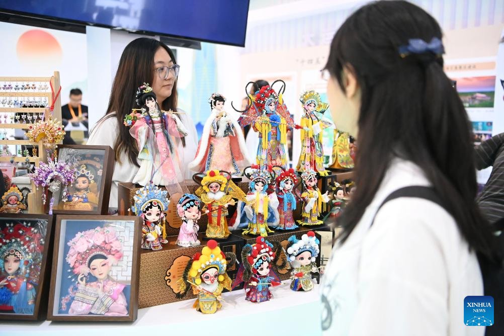 People view Beijing silk figurine products displayed at the 2025 China International Fair for Trade in Services (CIFTIS) in Beijing, capital of China, Sept. 11, 2025. The 2025 CIFTIS is held from Sept. 10 to 14 at the Shougang Park in Beijing. This year's fair features a wide range of cultural and creative products, which are highly popular among visitors. (Xinhua/Xiao Xiao)