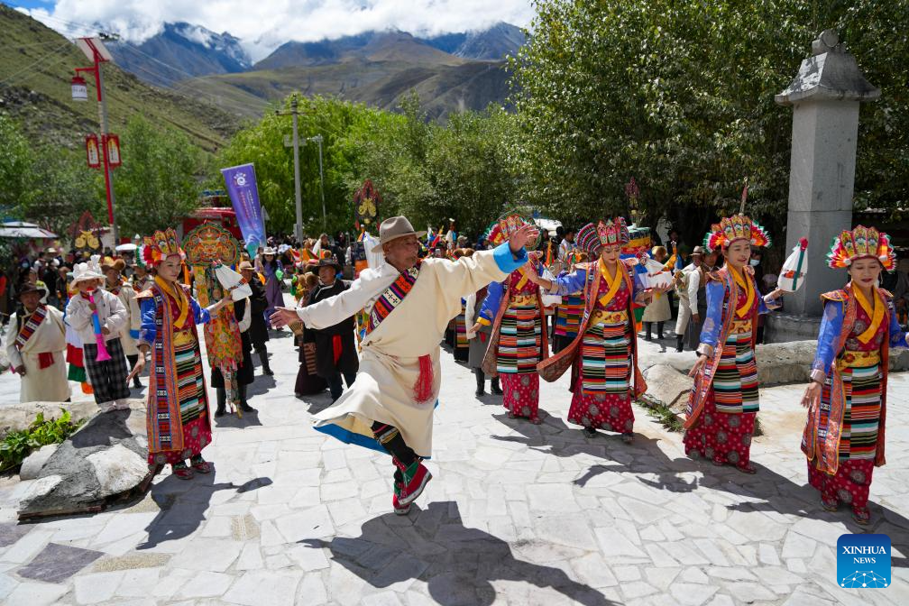 Local residents perform at the opening ceremony of a tourism festival featuring traditional Tibetan incense culture in Nyemo County of Lhasa, southwest China's Xizang Autonomous Region, Sept. 12, 2025. (Xinhua/Jigme Dorje)