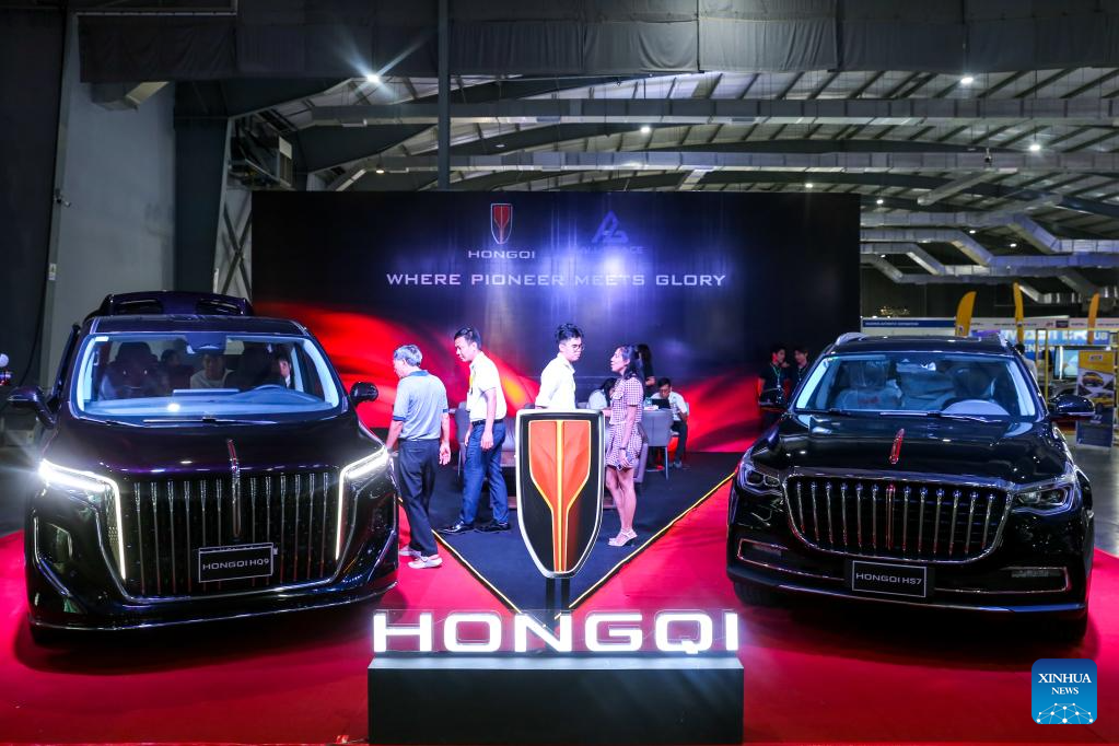 People visit the booth of Hongqi at the Myanmar Auto &Parts Expo 2025 in Yangon, Myanmar, Sept. 12, 2025. The expo kicked off here on Friday. (Xinhua/Myo Kyaw Soe)