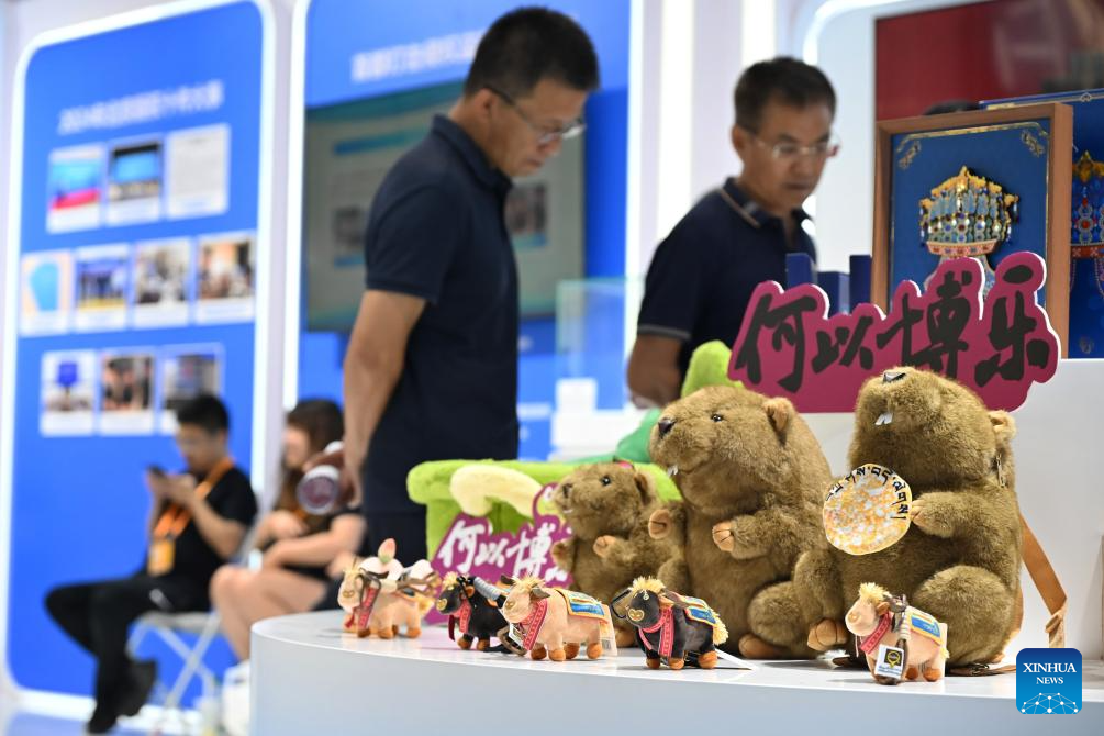 People view cultural and creative products displayed at the 2025 China International Fair for Trade in Services (CIFTIS) in Beijing, capital of China, Sept. 12, 2025. The 2025 CIFTIS is held from Sept. 10 to 14 at the Shougang Park in Beijing. This year's fair features a wide range of cultural and creative products, which are highly popular among visitors. (Xinhua/Zhang Xinjing)