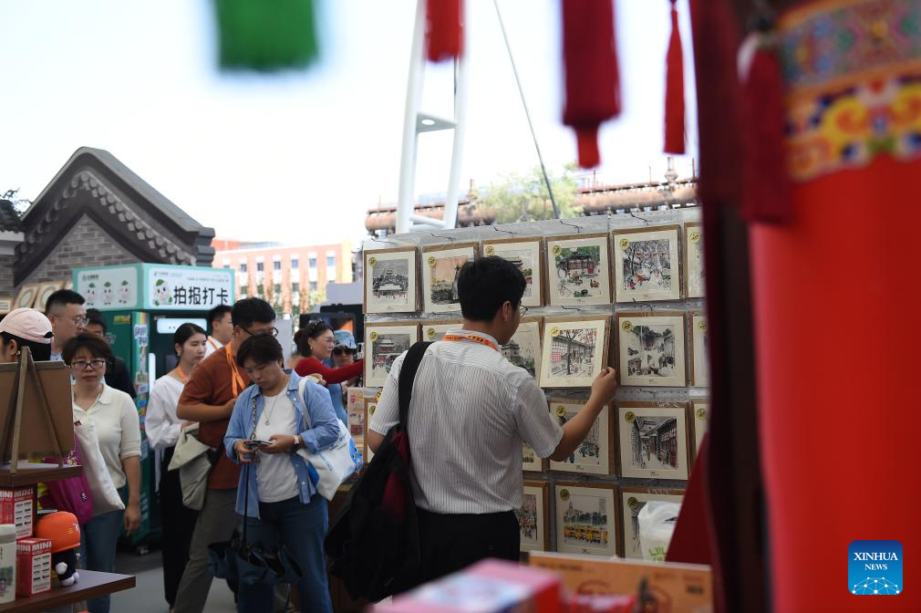 People learn about cultural and creative products displayed at the 2025 China International Fair for Trade in Services (CIFTIS) in Beijing, capital of China, Sept. 11, 2025. The 2025 CIFTIS is held from Sept. 10 to 14 at the Shougang Park in Beijing. This year's fair features a wide range of cultural and creative products, which are highly popular among visitors. (Xinhua/Zhang Xinjing)