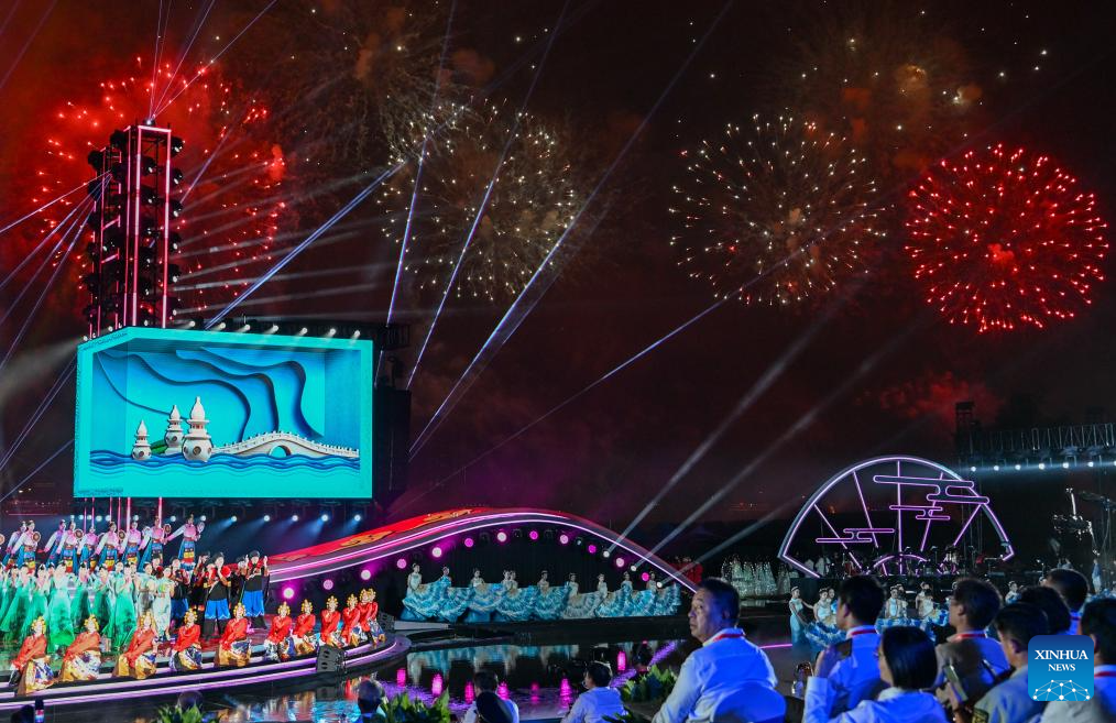 People watch a performance during the opening ceremony of the 2025 Yangtze River cultural and arts season in Wuhan, central China's Hubei Province, Sept. 12, 2025. The opening ceremony of the 2025 Yangtze River cultural and arts season was held in Wuhan on Friday. The event will run from Sept. 12 to Oct. 30, featuring a range of activities including art exhibitions, film week, and music week. (Xinhua/Du Zixuan)