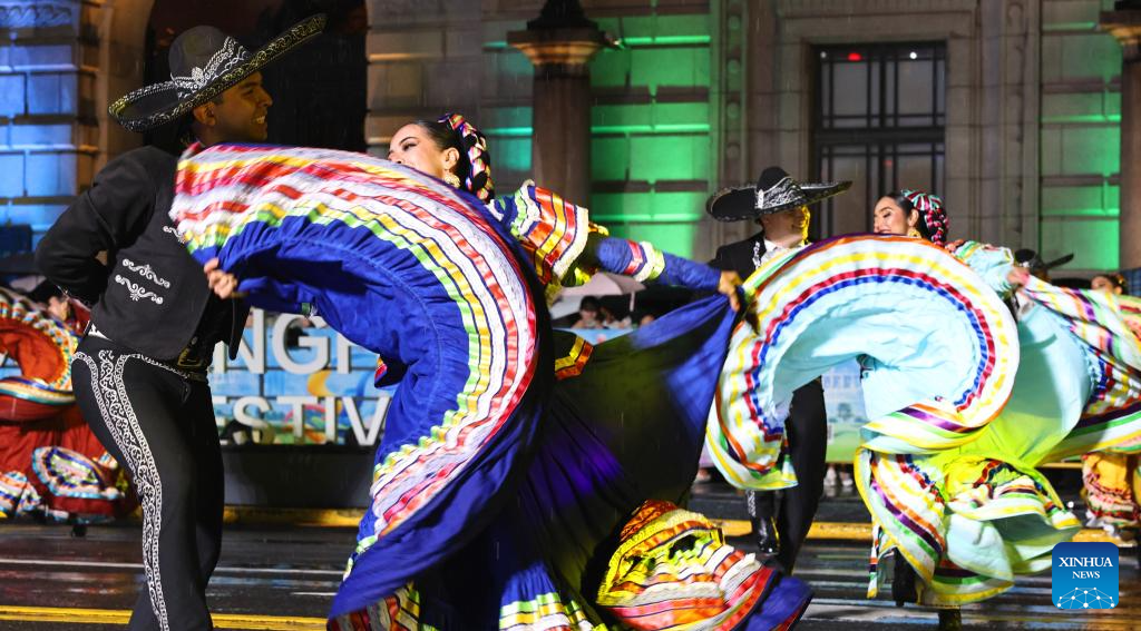 Dancers from Mexico perform during the floats parade of the Shanghai Tourism Festival in Shanghai, east China, Sept. 13, 2025.