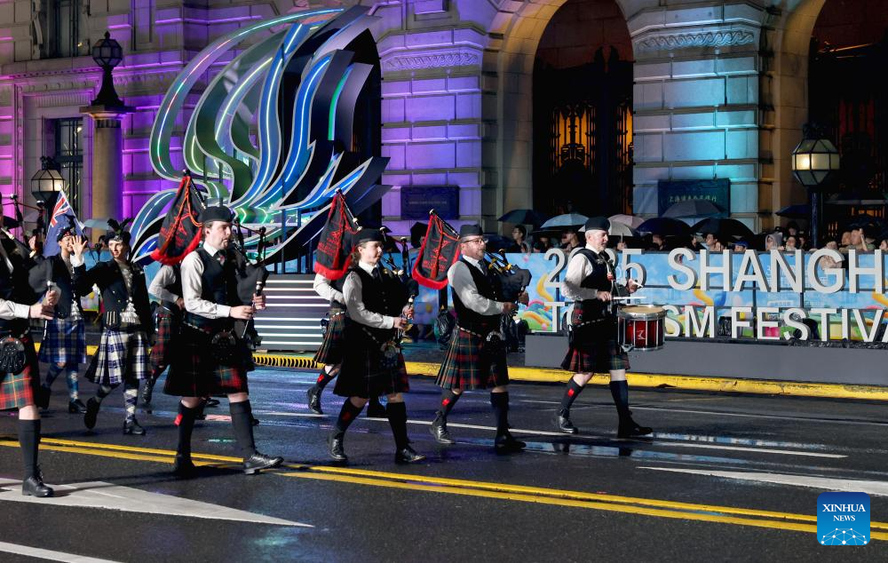 A bagpipe band from Melbourne of Australia performs during the floats parade of the Shanghai Tourism Festival in Shanghai, east China, Sept. 13, 2025.