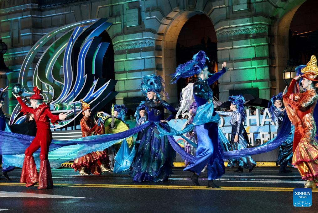 An art troupe from Russia performs during the floats parade of the Shanghai Tourism Festival in Shanghai, east China, Sept. 13, 2025.