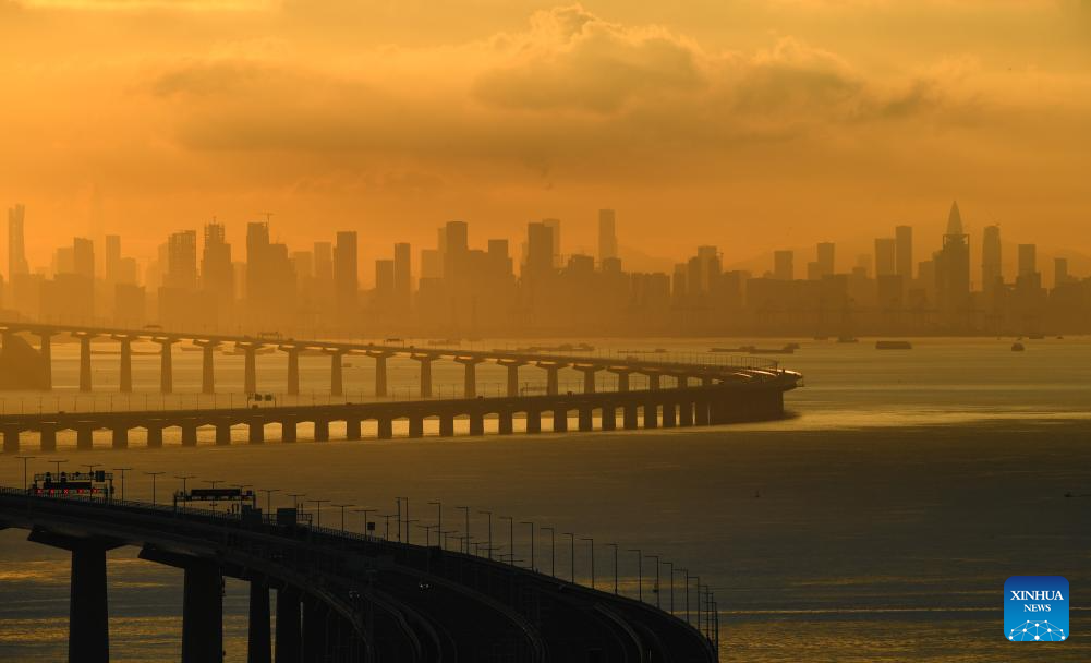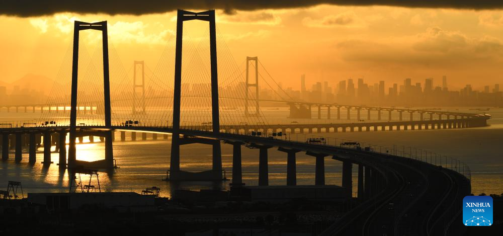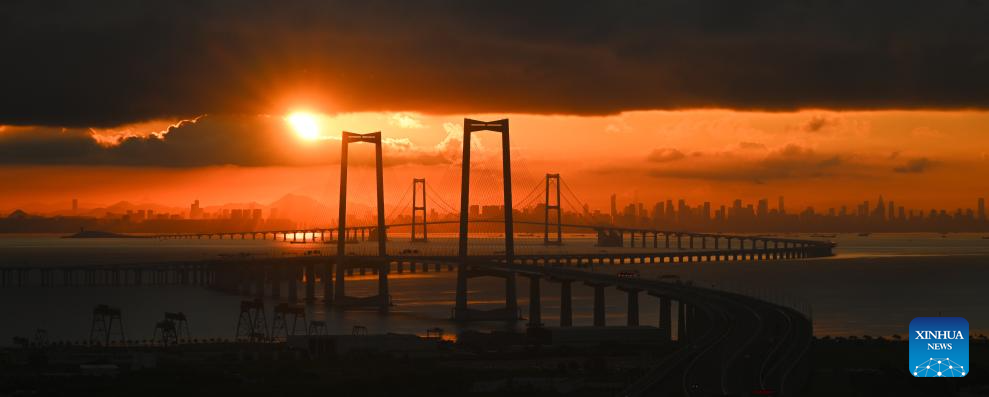 This photo taken on Sept. 14, 2025 shows a section of the Shenzhen-Zhongshan link at sunrise in south China's Guangdong Province. (Xinhua/Deng Hua)