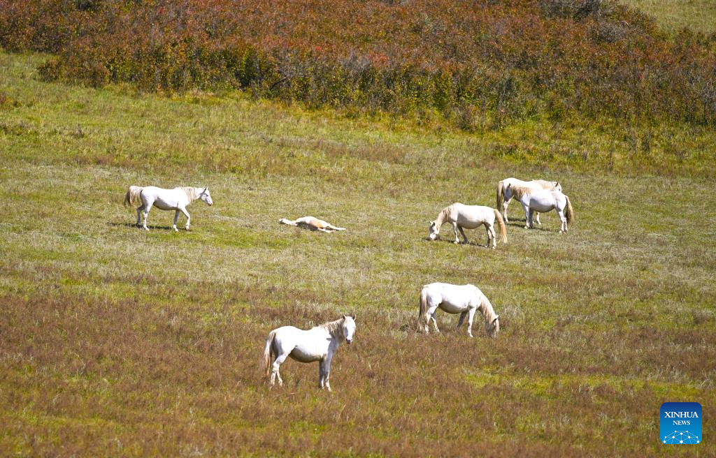 Horses forage on the Ulan Butong grassland in Hexigten Banner of Chifeng, north China's Inner Mongolia Autonomous Region, Sept. 12, 2025. (Xinhua/Peng Yuan)