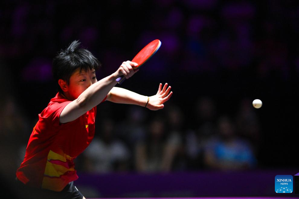 Sun Yingsha of China competes during the women's singles final match against Wang Manyu of China at the 2025 World Table Tennis (WTT) Champions Macao in Macao, south China, Sept. 14, 2025. (Xinhua/Cheong Kam Ka)