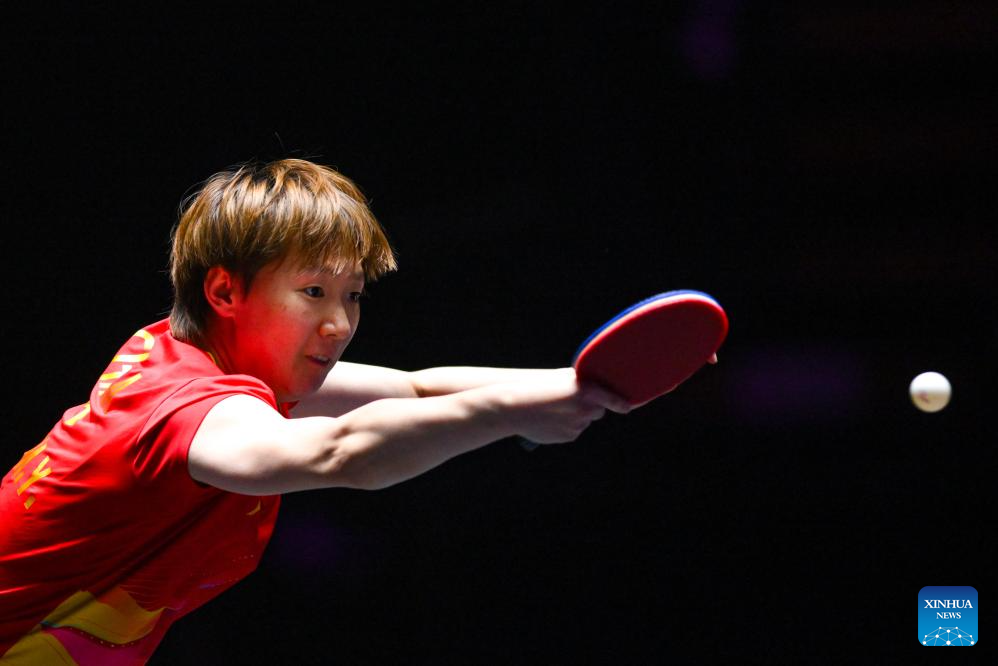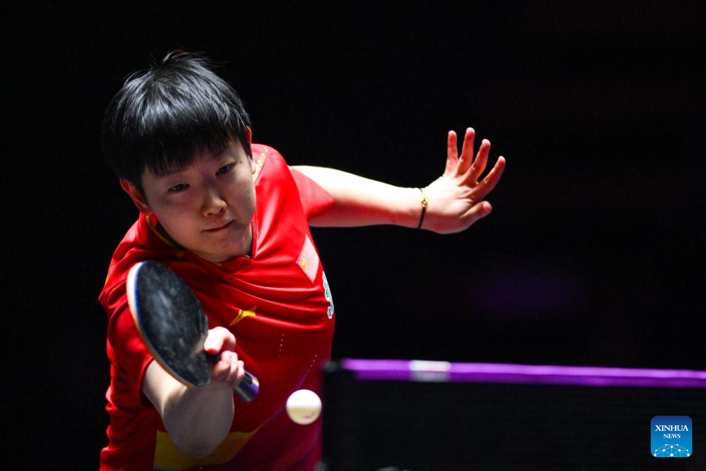 Sun Yingsha of China competes during the women's singles final match against Wang Manyu of China at the 2025 World Table Tennis (WTT) Champions Macao in Macao, south China, Sept. 14, 2025. (Xinhua/Cheong Kam Ka)