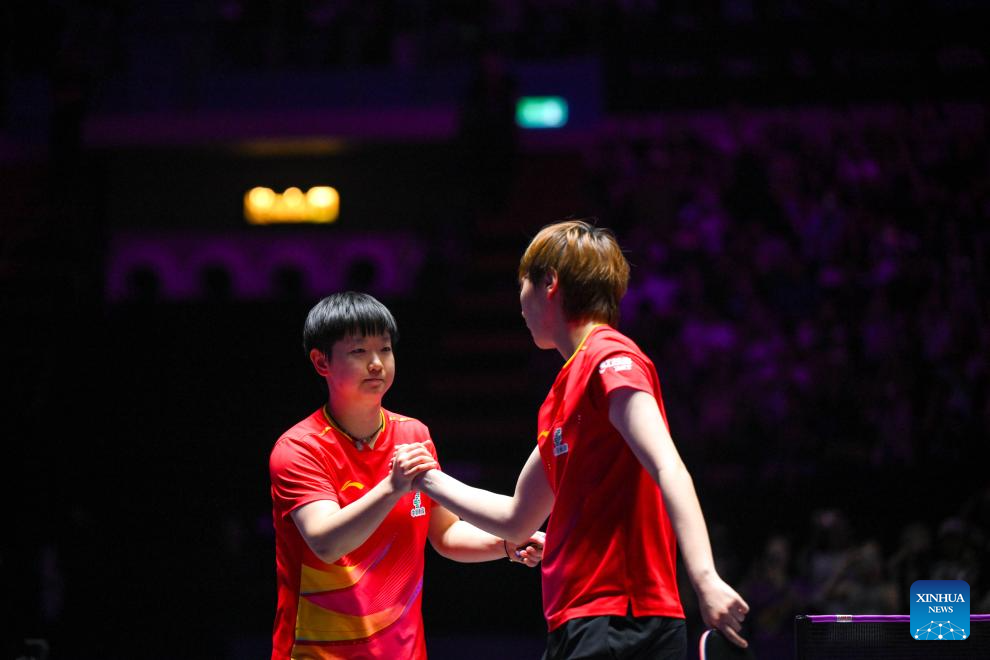 Sun Yingsha (L) of China shakes hands with her compatriot Wang Manyu after the women's singles final match at the 2025 World Table Tennis (WTT) Champions Macao in Macao, south China, Sept. 14, 2025. (Xinhua/Cheong Kam Ka)
