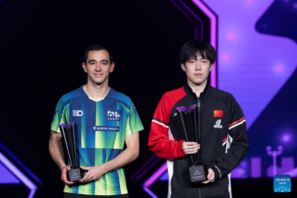 Wang Chuqin (R) of China and Hugo Calderano of Brazil pose during the trophy presentation after the men's singles final match between Wang Chuqin of China and Hugo Calderano of Brazil at the 2025 World Table Tennis (WTT) Champions Macao in Macao, south China, Sept. 14, 2025. (Xinhua/Cheong Kam Ka)