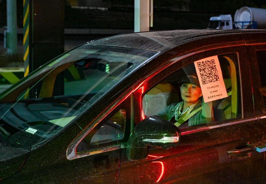 Car transporter Gao Yun scans the QR code for customs clearance at a inspection site of the road port of Horgos in Horgos, northwest China's Xinjiang Ugyur Autonomous Region, in the early morning on June 11, 2025. (Xinhua/Chen Shuo)