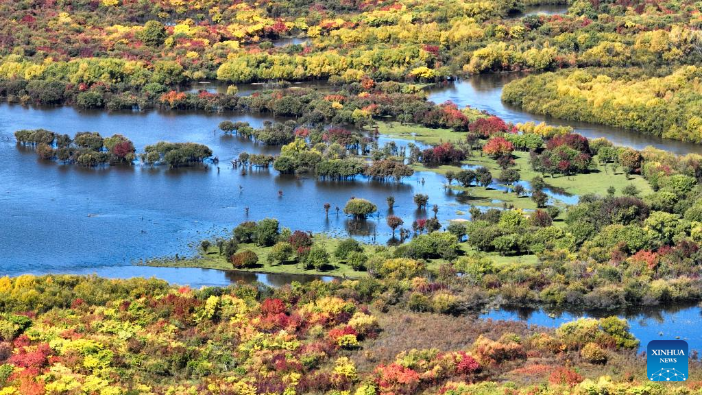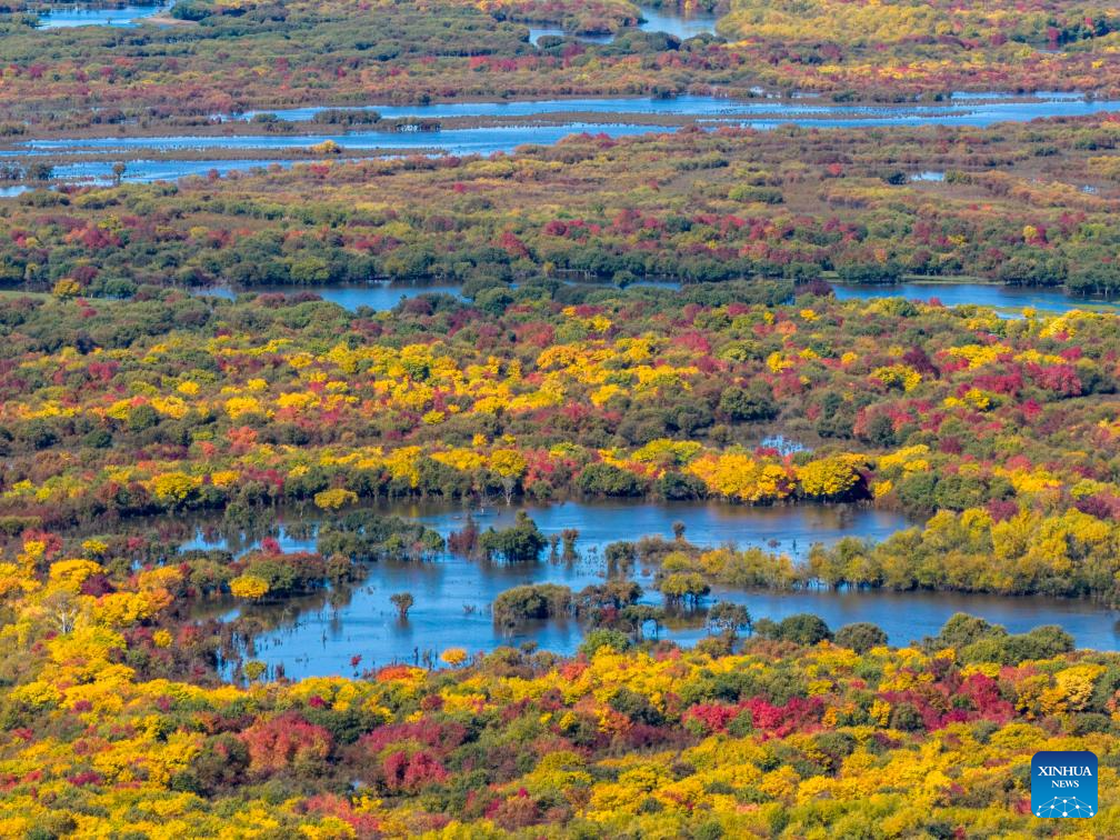 A drone photo taken on Sept. 15, 2025 shows horses grazing in the wetland around the Ergune River in Hulun Buir, north China's Inner Mongolia Autonomous Region. (Xinhua/Ma Jinrui)