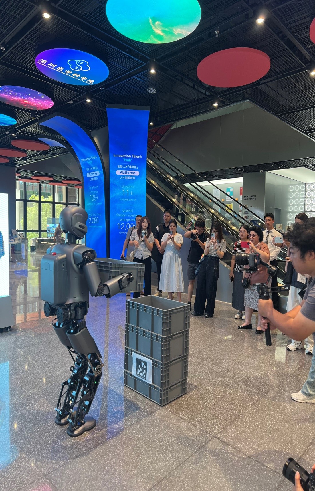 Reporters observe a humanoid robot carrying a box at the Qianhai Shenzhen-Hong Kong Youth Innovation and Entrepreneurship Hub, Sept. 15, 2025. (Photo/People's Daily Online)