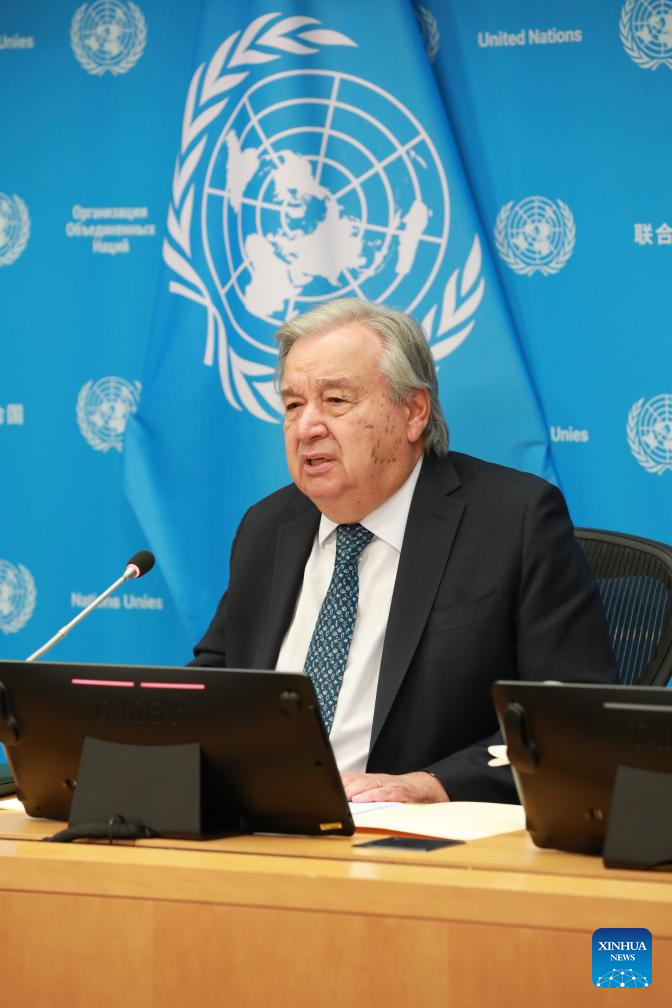 UN Secretary-General Antonio Guterres (R, Rear) holds a press briefing at the UN headquarters in New York, Sept. 16, 2025. Guterres said on Tuesday that the global initiatives proposed by China are totally compatible with the UN Charter. (Xinhua/Xie E)