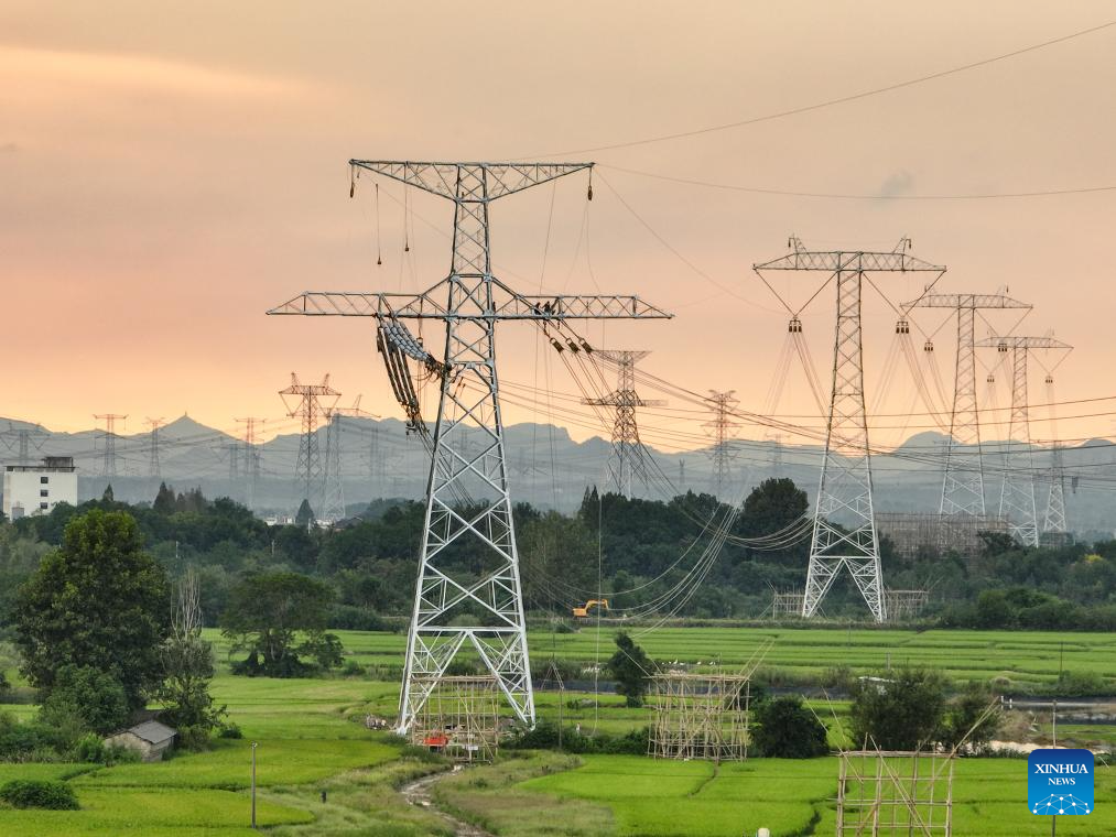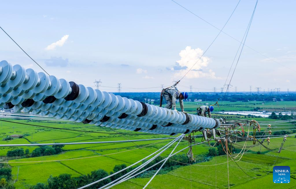 A drone photo taken on Sept. 16, 2025 shows workers carrying out conductor stringing tasks for the Gansu-Zhejiang ±800 kV ultra-high voltage (UHV) direct current transmission project in Nanling County, Wuhu, east China's Anhui Province. The Anhui section of this power transmission project linking northwest China's Gansu Province with east China's Zhejiang Province has recently entered the conductor stringing phase.