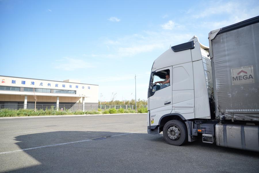 Workers unload goods for export from a truck at the Alashankou Cross-border E-commerce Industrial Park in northwest China's Xinjiang Uygur Autonomous Region, Sept. 11, 2025. (Xinhua/Zhang Haobo)