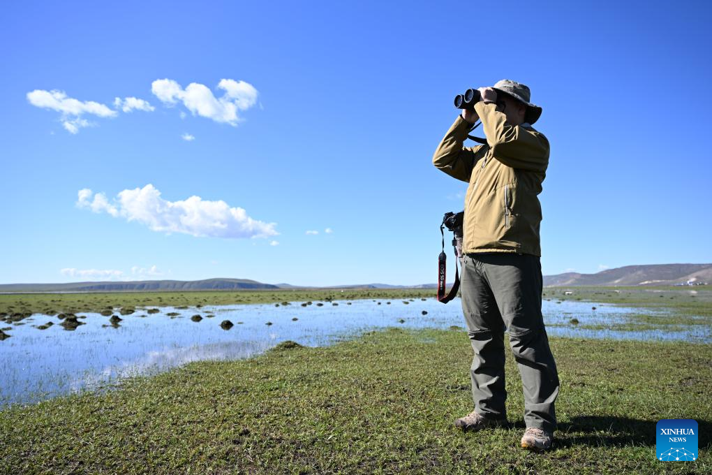 Bao Jincai observes birds with a telescope in the Ergune Wetland Nature Reserve in Hulun Buir, north China's Inner Mongolia Autonomous Region, Sept. 15, 2025. (Xinhua/Bei He)