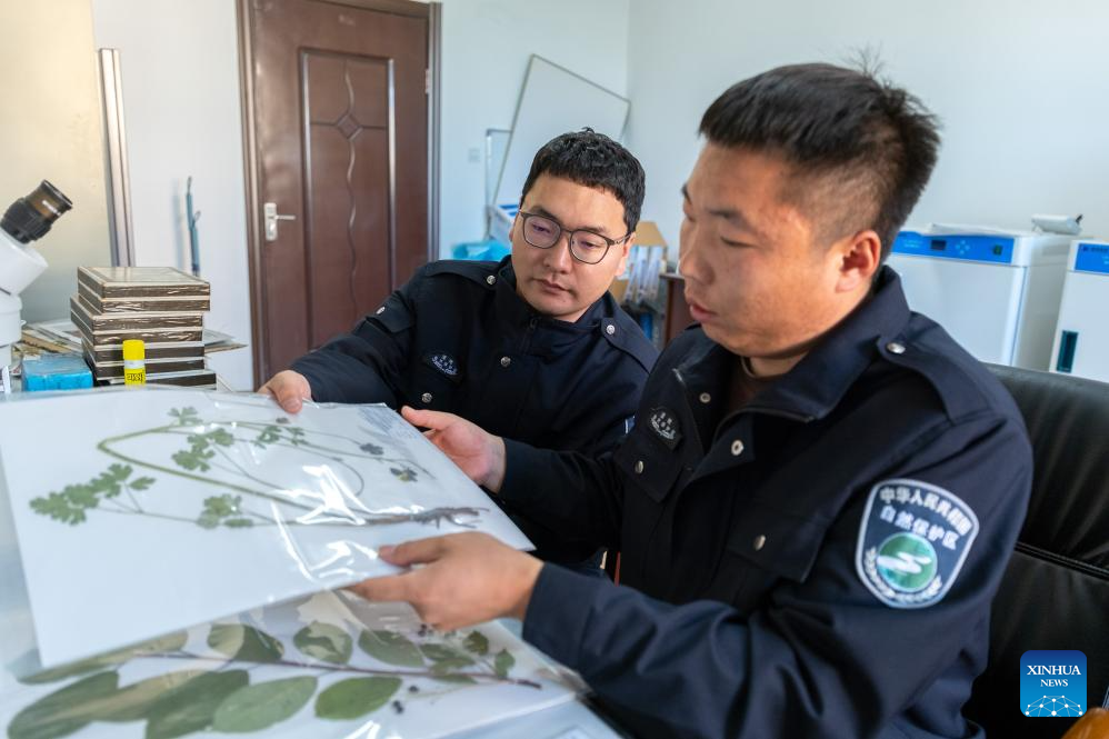 Bao Jincai (L) and his colleague arrange plant specimens collected in the Ergune wetland at Ergune Wetland Nature Reserve Administration in Hulun Buir, north China's Inner Mongolia Autonomous Region, Sept. 16, 2025. (Xinhua/Ma Jinrui)