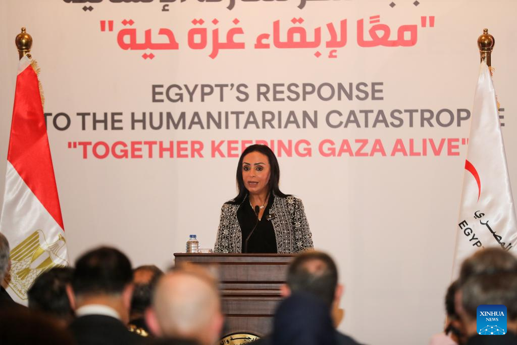 Egyptian Social Solidarity Minister Maya Morsy speaks during an event to honor the Egyptian Red Crescent and its volunteers for their efforts in Gaza humanitarian aid in Cairo, Egypt, Sept. 17, 2025. Egypt on Wednesday honored the Egyptian Red Crescent (ERC) and its volunteers for sustaining aid to Gaza, reaffirming its humanitarian and political support for the Palestinian people. (Xinhua/Sui Xiankai)