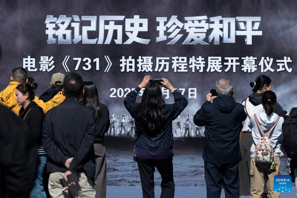 Visitors take photos at the opening ceremony of a special exhibition on the shooting process of Evil Unbound, a film about Unit 731, in Harbin, northeast China's Heilongjiang Province, Sept. 17, 2025.