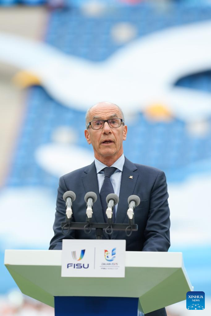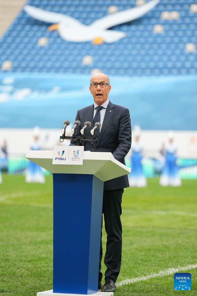Leonz Eder, president of FISU, delivers a speech during the opening ceremony of the 2025 FISU University World Cup Football held in Suoyuwan Stadium in Dalian, northeast China's Liaoning Province, Sept. 17, 2025. (Xinhua/Zheng Huansong)