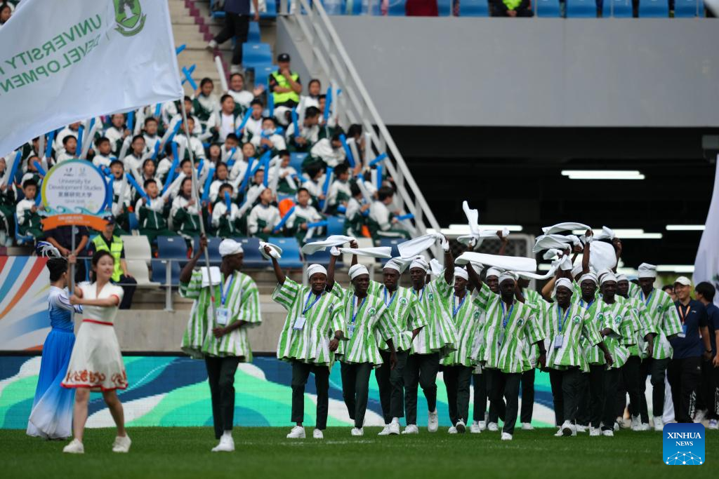 Delegation of Lagos State University from Nigeria parade during the opening ceremony of the 2025 FISU University World Cup Football held in Suoyuwan Stadium in Dalian, northeast China's Liaoning Province, Sept. 17, 2025. (Xinhua/Zheng Huansong)