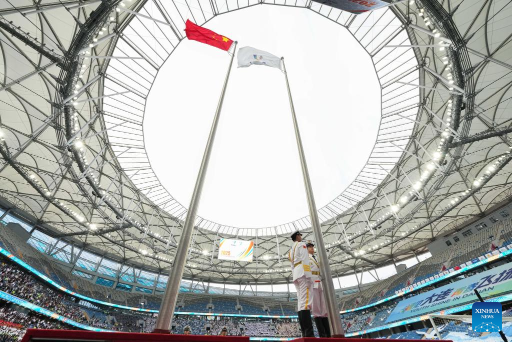 The Chinese national flag is carried during the opening ceremony of the 2025 FISU University World Cup Football held in Suoyuwan Stadium in Dalian, northeast China's Liaoning Province, Sept. 17, 2025. (Xinhua/Zheng Huansong)