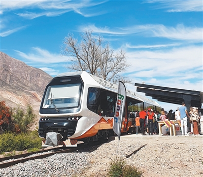 On December 7, 2023, the inaugural ceremony of the new energy light rail train in Jujuy, Argentina, was held at the Volcán railway station in Jujuy Province, attracting nationwide attention in Argentina. This represents the first time that China has exported a new energy light rail train overseas. The train operates on the 35-kilometer-long meter-gauge intercity branch railway of the Belgrano C line in Jujuy Province, mainly serving the locally renowned world cultural heritage site - the Quebrada de Humahuaca. As a train servicing a tourist attraction, its design incorporates abundant elements from the Quebrada de Humahuaca. The exterior of the train features a combination of white as the main tone and orange mountain-inspired lines, while the interior is adorned with patterned ceilings, red seating, and ultra-wide-angle viewing windows. These elements enable the train to blend seamlessly into the natural landscape, imbuing the journey with a distinct holiday ambiance.