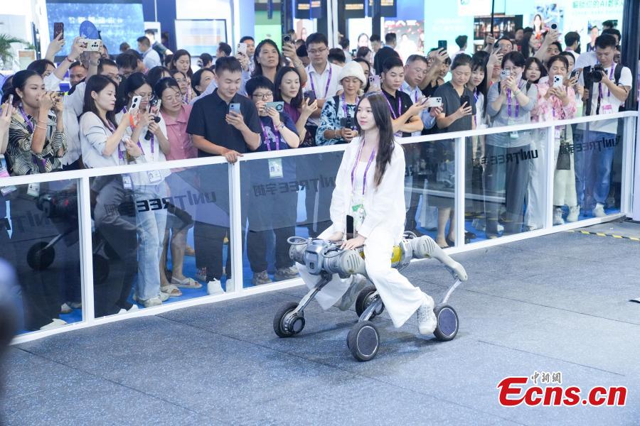 A staff member rides a robotic dog to patrol to demonstrate its load-carrying capacity at the 22nd China-ASEAN Expo in Nanning, Guangxi Zhuang Autonomous Region, Sept. 17, 2025. (Photo: China News Service/Chen Guanyan)