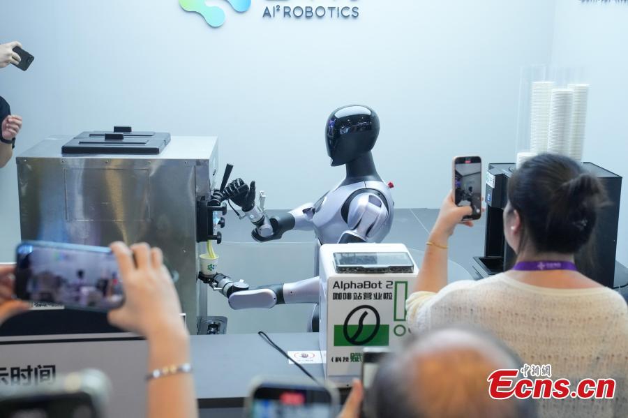 Photo taken on Sept. 17, 2025 shows a robot making coffee for participants at the 22nd China-ASEAN Expo which is being held in Nanning, Guangxi Zhuang Autonomous Region. (Photo: China News Service/Chen Guanyan)