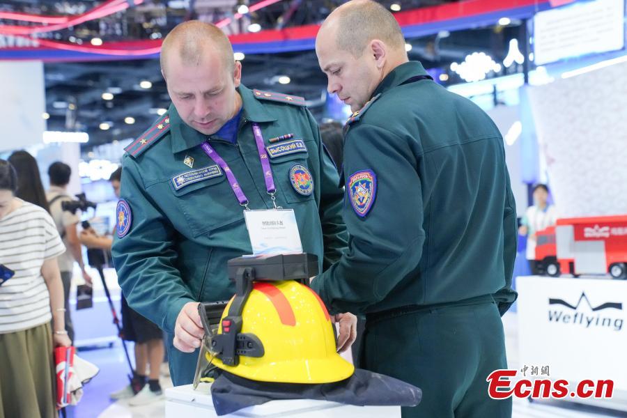 Visitors observe an intelligent fire-fighting helmet at the 22nd China-ASEAN Expo in Nanning, Guangxi Zhuang Autonomous Region, Sept. 17, 2025. (Photo: China News Service/Chen Guanyan)