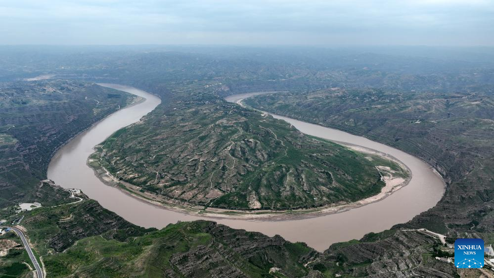 An aerial photo taken on July 24, 2025 shows a turning of the Yellow River in the border area between Shilou County of north China's Shanxi Province and Qingjian County of northwest China's Shaanxi Province. (Xinhua/Zhan Yan)