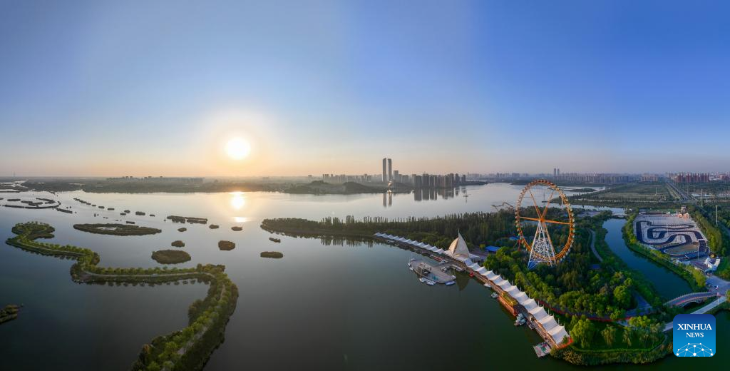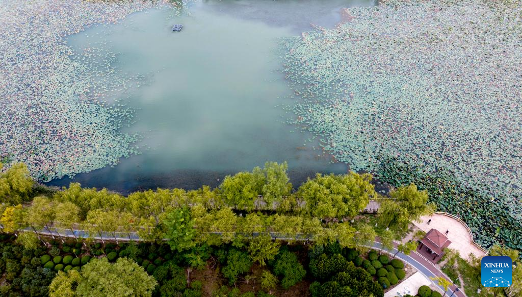 An aerial drone photo taken on Aug. 16, 2025 shows a view of Yuehai national wetland park in Yinchuan, northwest China's Ningxia Hui Autonomous Region.