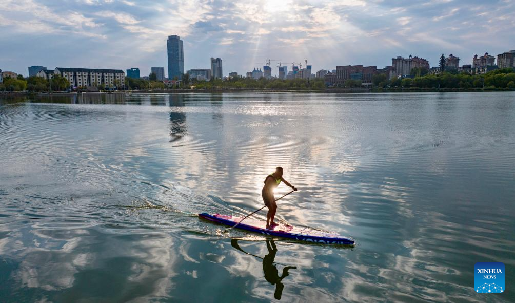A drone photo shows a man paddling at Haibao Park in Yinchuan, northwest China's Ningxia Hui Autonomous Region, Sept. 17, 2025.